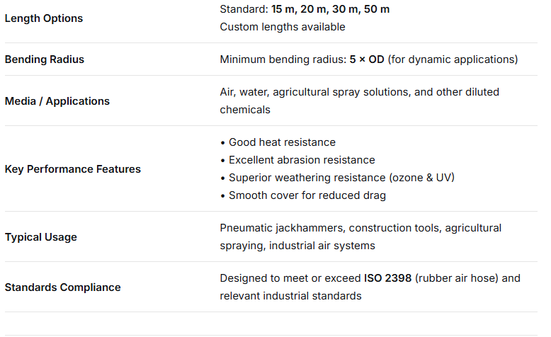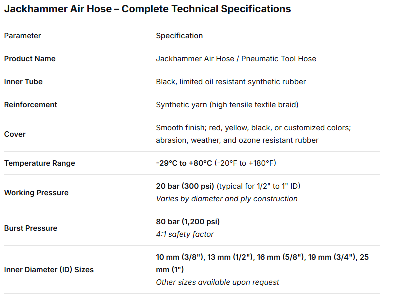 This jackhammer air hose is engineered for heavy‑duty pneumatic tools and demanding work environments. It features a heat‑resistant synthetic rubber tube, a high‑strength synthetic yarn reinforcement braid, and a smooth cover made from abrasion, weather, and ozone resistant rubber. The cover is available in standard red, yellow, black, or custom colors. With a working pressure of 20 bar (300 psi) and a 4:1 safety factor (burst pressure 80 bar / 1,200 psi),
