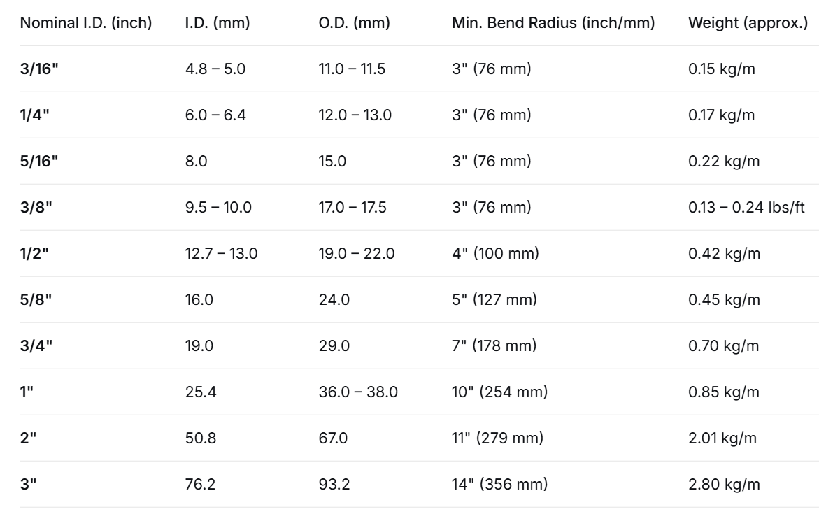 • Tube (Inner Core): High-grade Nitrile (NBR) rubber. ARPM Class A (High oil resistance). Resistant to gasoline, diesel, and aromatics up to 50% content. -